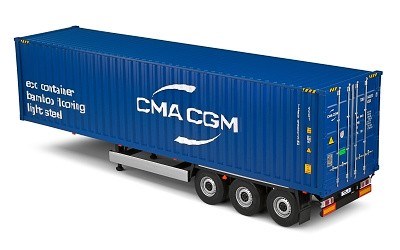 Samotný kontejner CMA CGM v charakteristickém modrém odstínu je zdoben logy společnosti, čísly a dalšími drobnými potisky, které přesně kopírují skutečné značení používané v námořní dopravě. Povrchová struktura kontejneru připomíná kovové výztuhy originálu, včetně pantů, zámků a úchytů pro manipulaci. Model tak působí jako přesná zmenšenina skutečného přepravního modulu, který lze snadno umístit na tahač odpovídajícího měřítka.