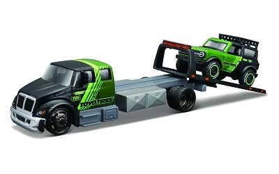 MAISTO 15055-01 model auta MAISTO DESIGN INTERNATIONAL LONESTAR FLATBED w/ FORD BRONCO WILDTRACK 2021 GREEN / BLACK v měřítku 1:64.