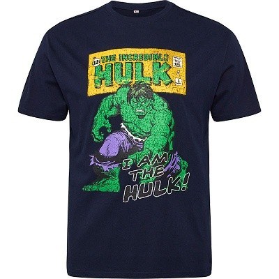 Nadměrné pánské tričko NORTH 53355 tmavě modré s potiskem HULK ( Marvel ) krátký rukáv v nadměrných velikostech 5XL, 6XL, 7XL a- 8XL. Kulatý výstřih.