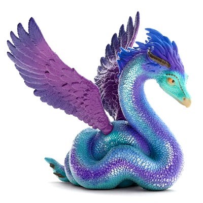 SCHLEICH® 14903 představuje fascinující mytickou bytost Okamie z řady Fantastická zvířata™. Okamie vyniká nádherným fialově zbarveným peřím a hadovitým tělem, jehož kůže se třpytí tyrkysově fialovými odstíny. Hlava je zakončena ostrým zobákem a velké žluté oči bedlivě sledují okolí, což dodává figurce realistický a dramatický vzhled. Tento tvor je nejen krásný, ale má i choranaptyxistické vlastnosti, což znamená, že dokáže měnit svou velikost podle okolního prostoru a zjevuje se pouze tehdy, když chce být viděn.