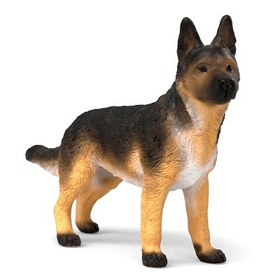 Figurka zobrazuje německého ovčáka ve výstražném postoji, typickém pro psy tohoto plemene. Hustá srst, dobře tvarované uši a pozorný výraz hlavy podtrhují charakter pracovního psa, který je připraven chránit statek i rodinu. Každý detail je ručně malovaný a propracovaný, což zajišťuje vysokou míru autenticity. Pevná a odolná konstrukce figurky dovoluje bezpečné hraní, přičemž zachovává věrnost skutečnému vzhledu plemene.