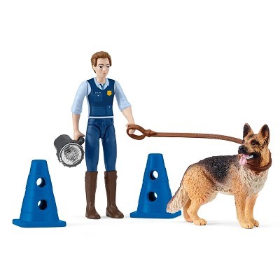 Sada obsahuje 1× figurku policisty, 1× německého ovčáka, 1× vodítko, 1× baterku a 2× kužel. Hrací sada funguje samostatně, ale lze ji kombinovat s dalšími figurkami a sety Schleich®. Děti si mohou vytvořit vlastní zásahovou scénu, tréninkové cvičení psa a rozvíjet příběhy plné napětí a spolupráce.