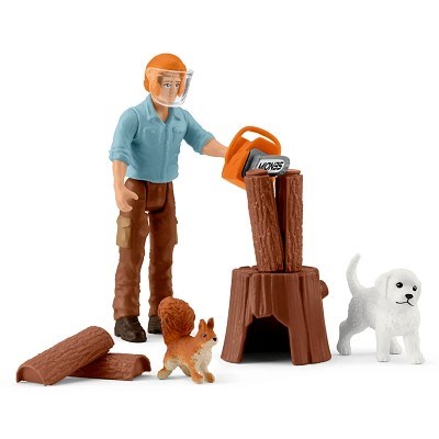 Součástí balení je figurka lesníka, štěně, veverka, přilba, motorová pila, špalek a čtyři kusy nasekaného dřeva.